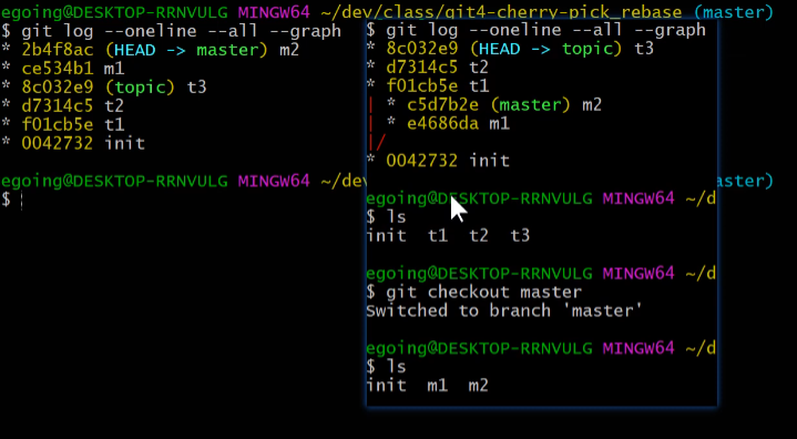 현재 그림에서 merge와 rebase의 결과로 만들어진 mt3와 m2의 결과는 과정만 다르고 내용은 완전히 같다.