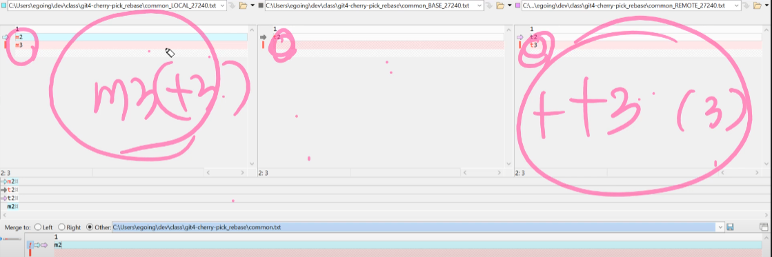 툴을 이용해서 보면 왼쪽의 현재의 버전이고 가운데가 cherry-pick 대상의 이전 버전이고 오른쪽이 cherry-pick 대상이다.