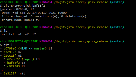위와 같이 git cherry-pick 뒤에 픽업하고 싶은 커밋의 아이디를 적으면 t2에서 작업했던 내용인 t2 파일의 추가라는 내용이 m2에 적용된 걸 확인할 수 있다. 그리고 로그를 다시 확인해보면 m1, m2라는 메세지를 가진 커밋이 위로 올라오고 그 위에 t2라는 메세지를 가진 커밋이 새롭게 하나가 더 추가가 된다.