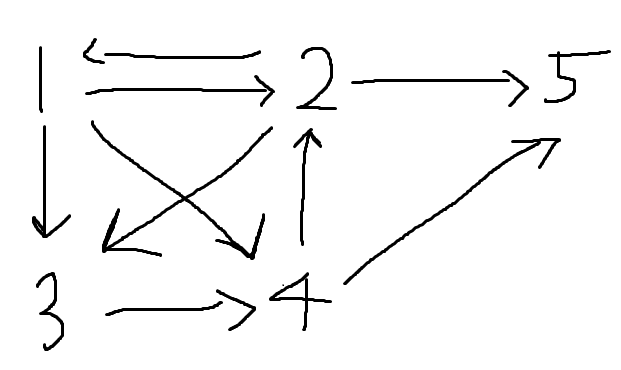 v == 5 n == 5 / v == n 이므로 5번 정점 도착. 1->4->2->5로 갈 수 있음(answer = 5)