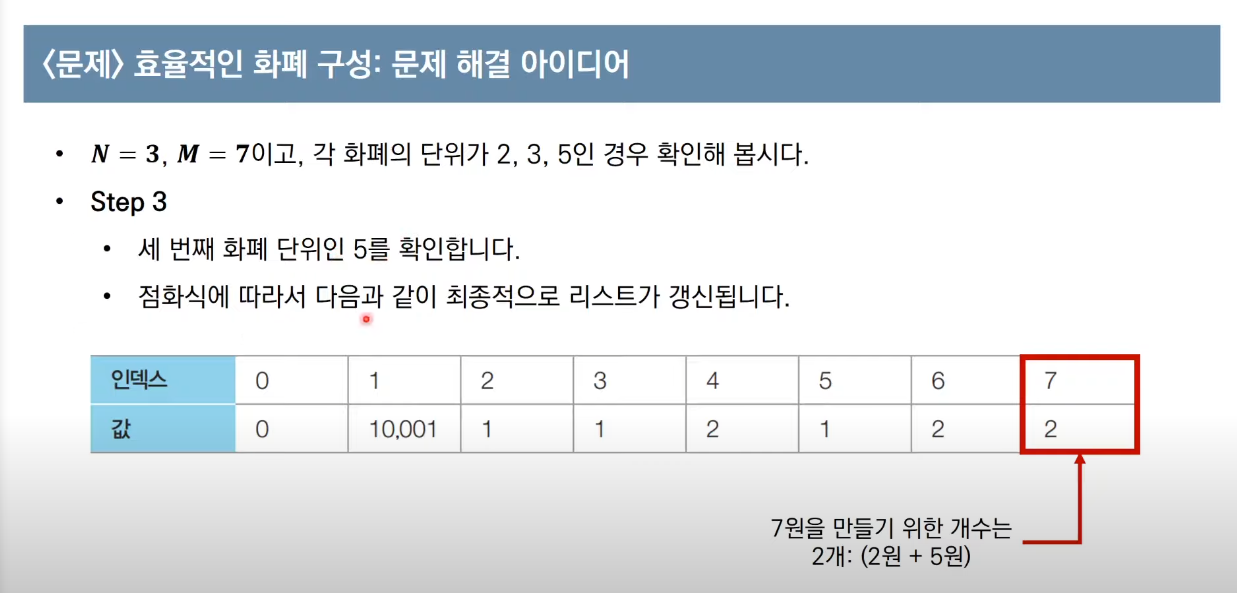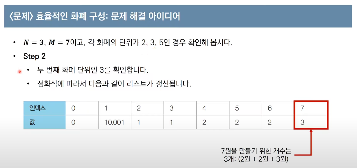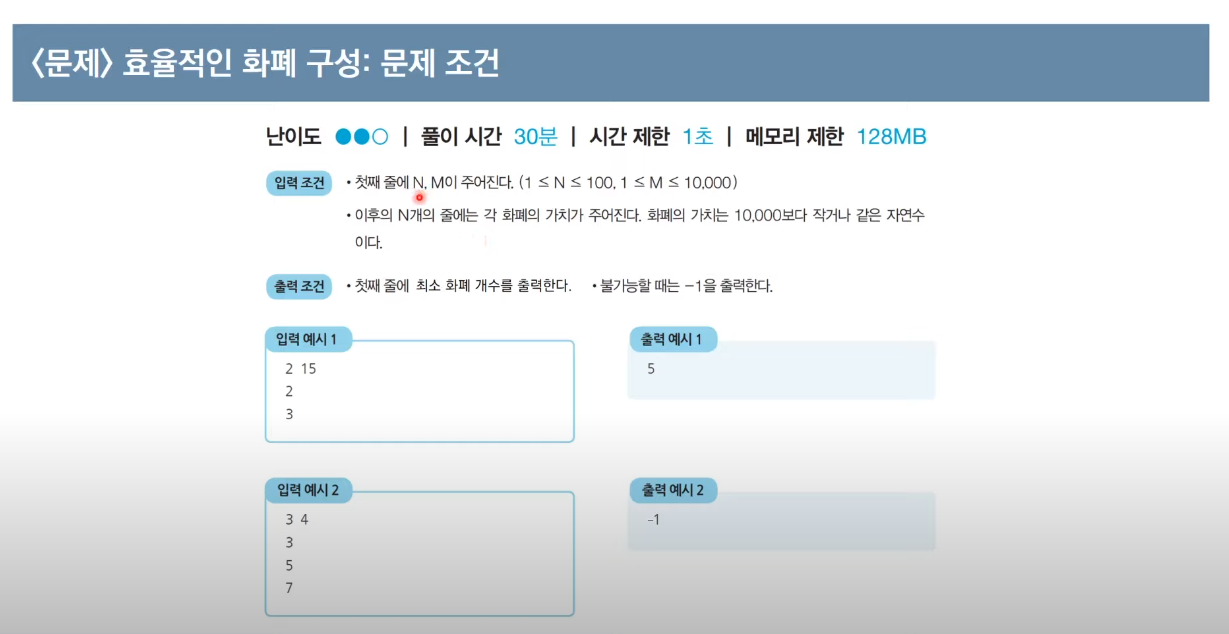 m원에 대한 최소 화폐 개수를 저장해놓는 d[m] 배열을 설정해놓고 화폐 단위에 따라 m원까지 탐색해나간다.
