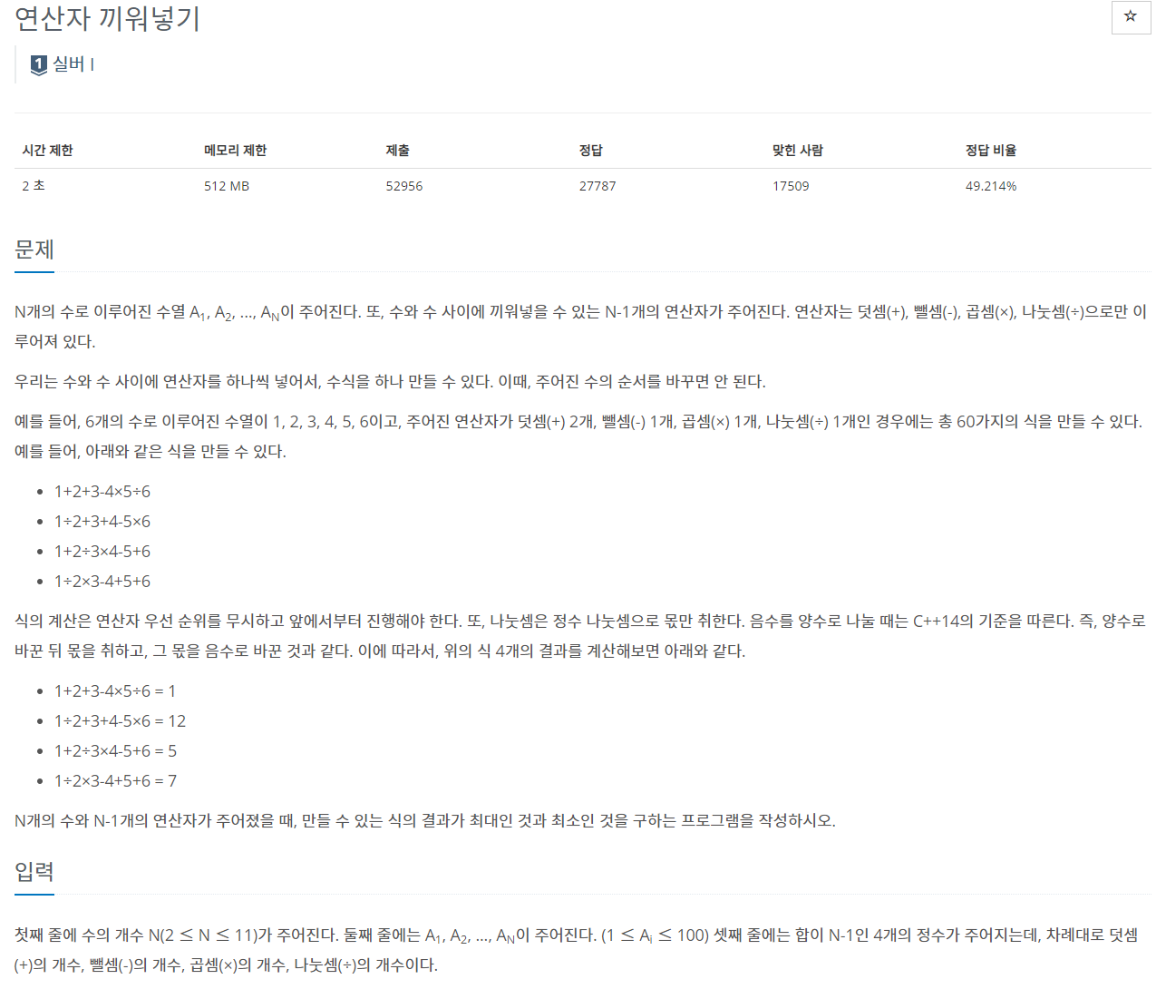 1,2,3,4,5,6 / 덧셈 2 뺄셈 1 곱셈 1 나눗셈 1