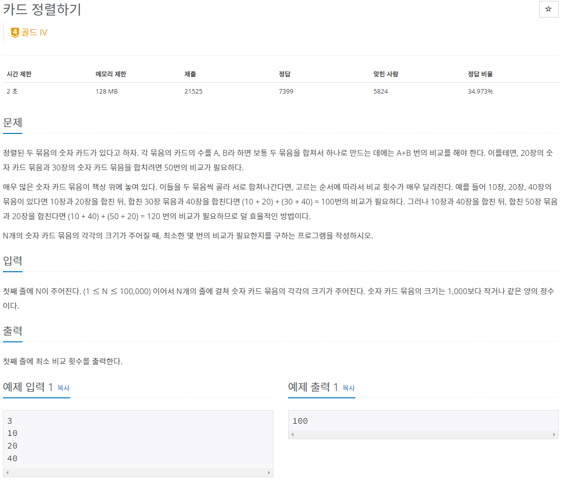 제일 작은 카드 묶음 끼리 묶어나가면서 합을 누적해나가는 문제