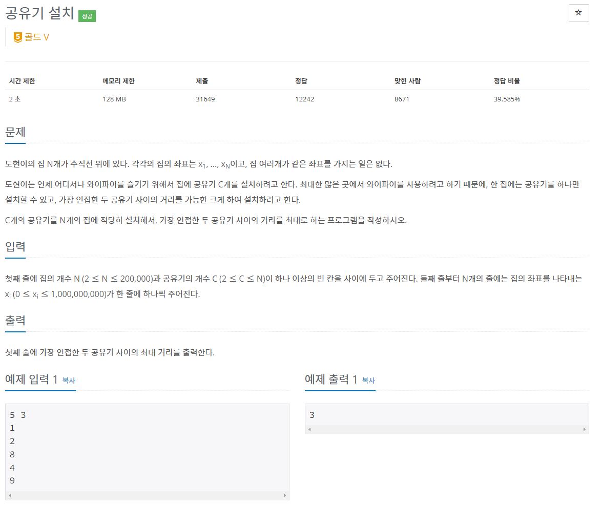설치 거리를 중간점으로 지정해놓고 이분탐색 수행하면 된다.