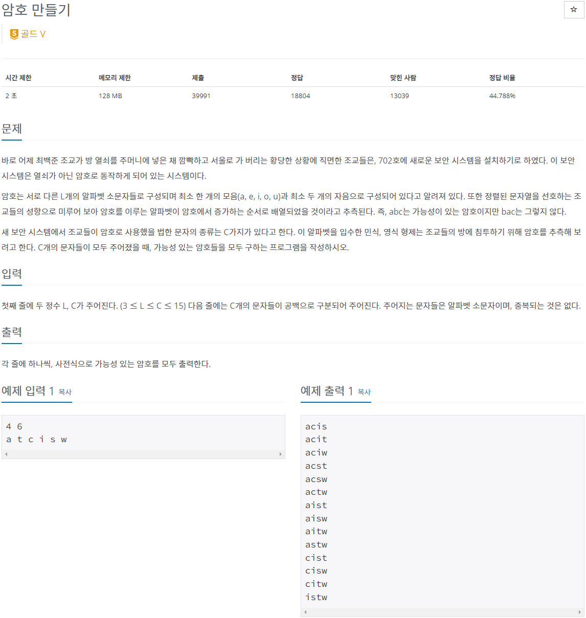 //최소 1개의 모음과 2개의 자음이 있어야함 그리고 오름차순 되어있어야함