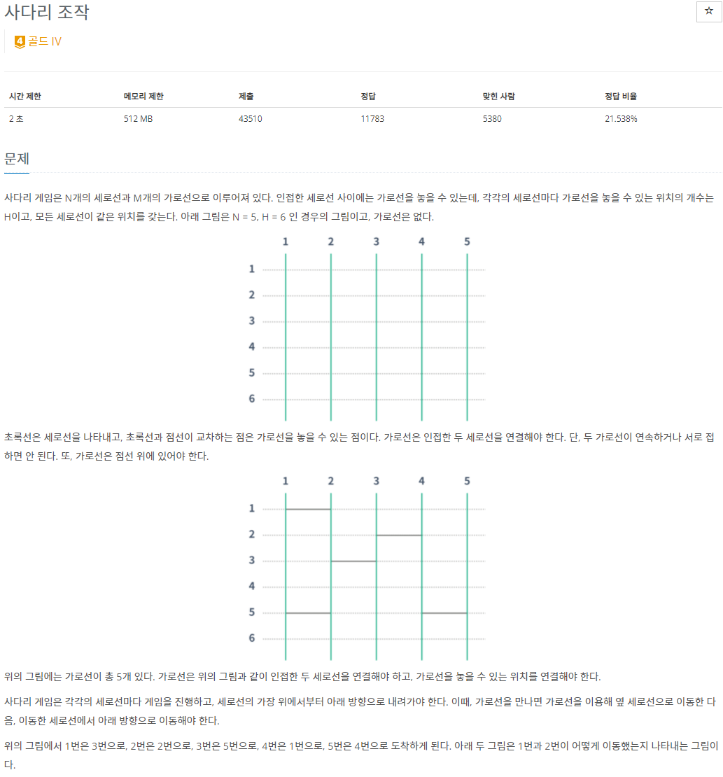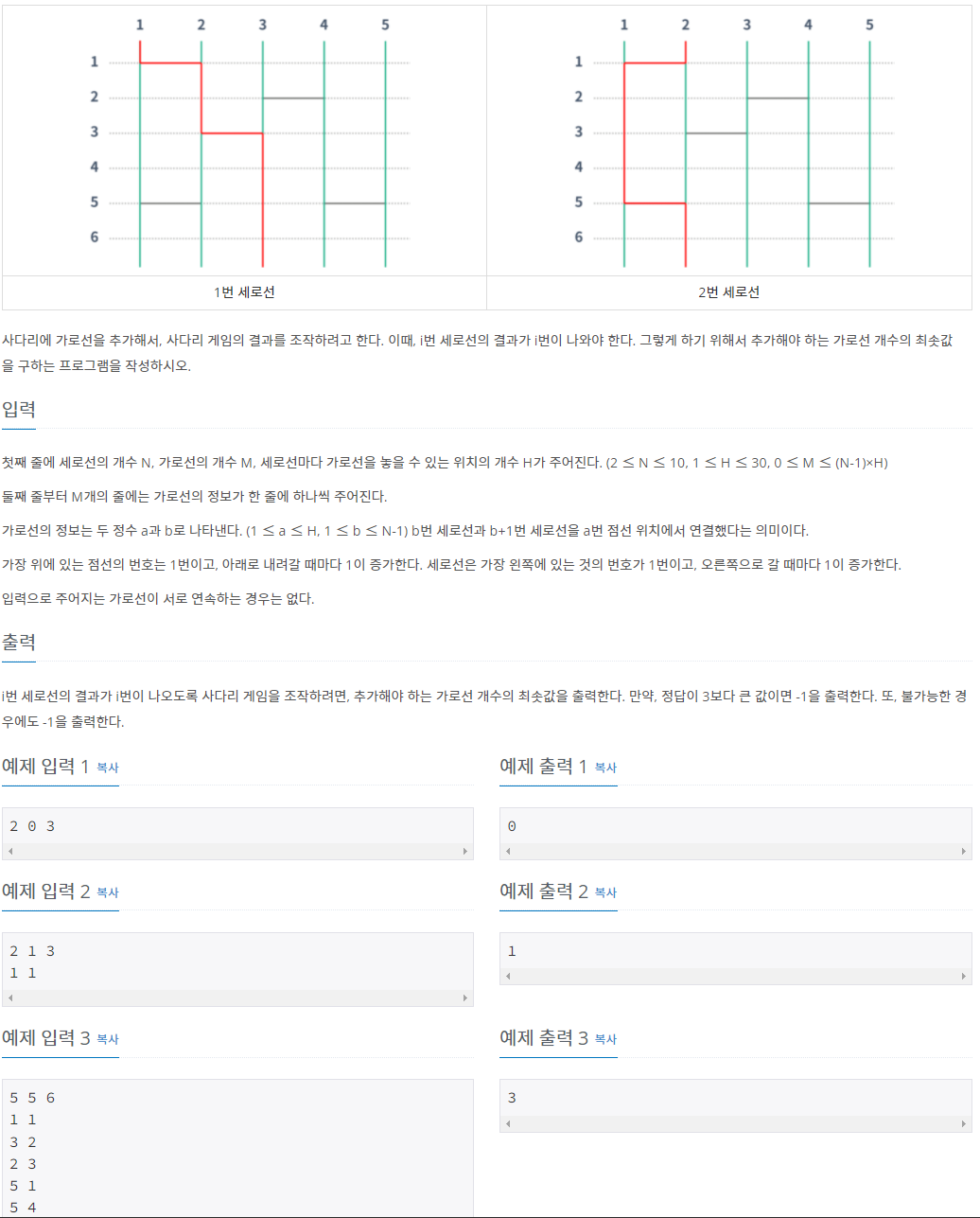 문제 이해하는데 시간이 꽤나 소요됐다. 가로선을 0~3번까지 추가하여 모든 지점에 대해서 가로선을 만들어 보는 완전탐색 & 백트래킹 문제 였다.