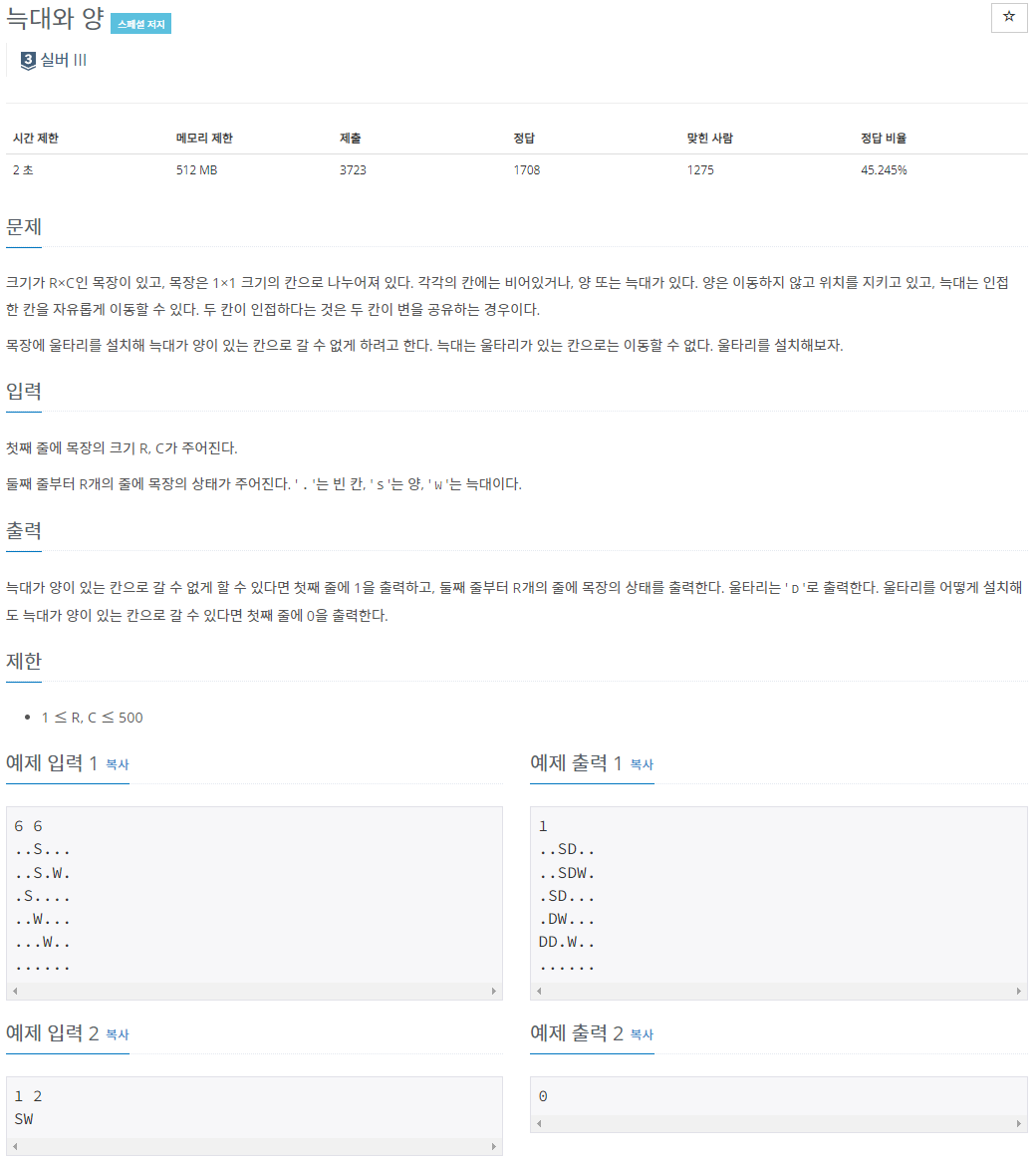 예제 출력이 그렇게 안나와있어서 늑대가 상하좌우로 무한정 이동할 수 있을거라고 생각했는데, 그냥 늑대 상하좌우로 울타리 쳐주면 되는 문제였다.