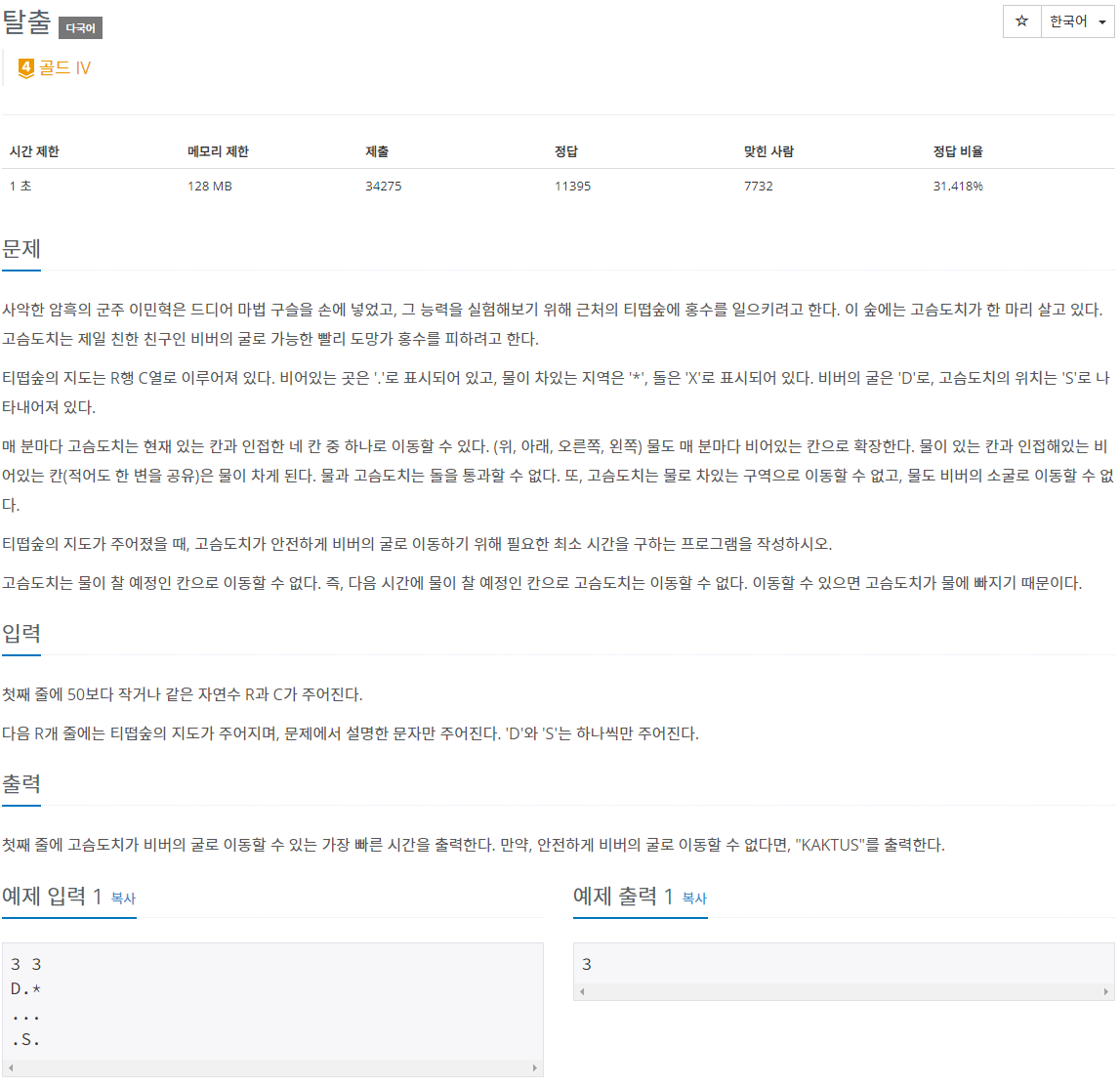 '고슴도치는 물이 찰 예정인 칸으로 이동할 수 없다.' 는 조건만 잘 처리해주고 물이 먼저 이동하도록 하면 풀리는 문제였다.