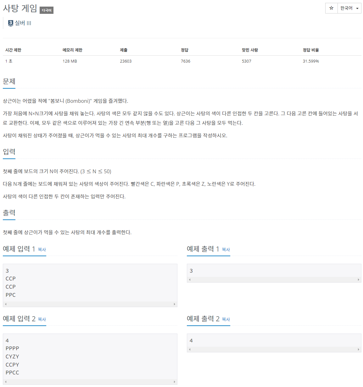사탕의 색이 다른 부분을 교환시켜서 긴 부분을 구하면 되는 문제