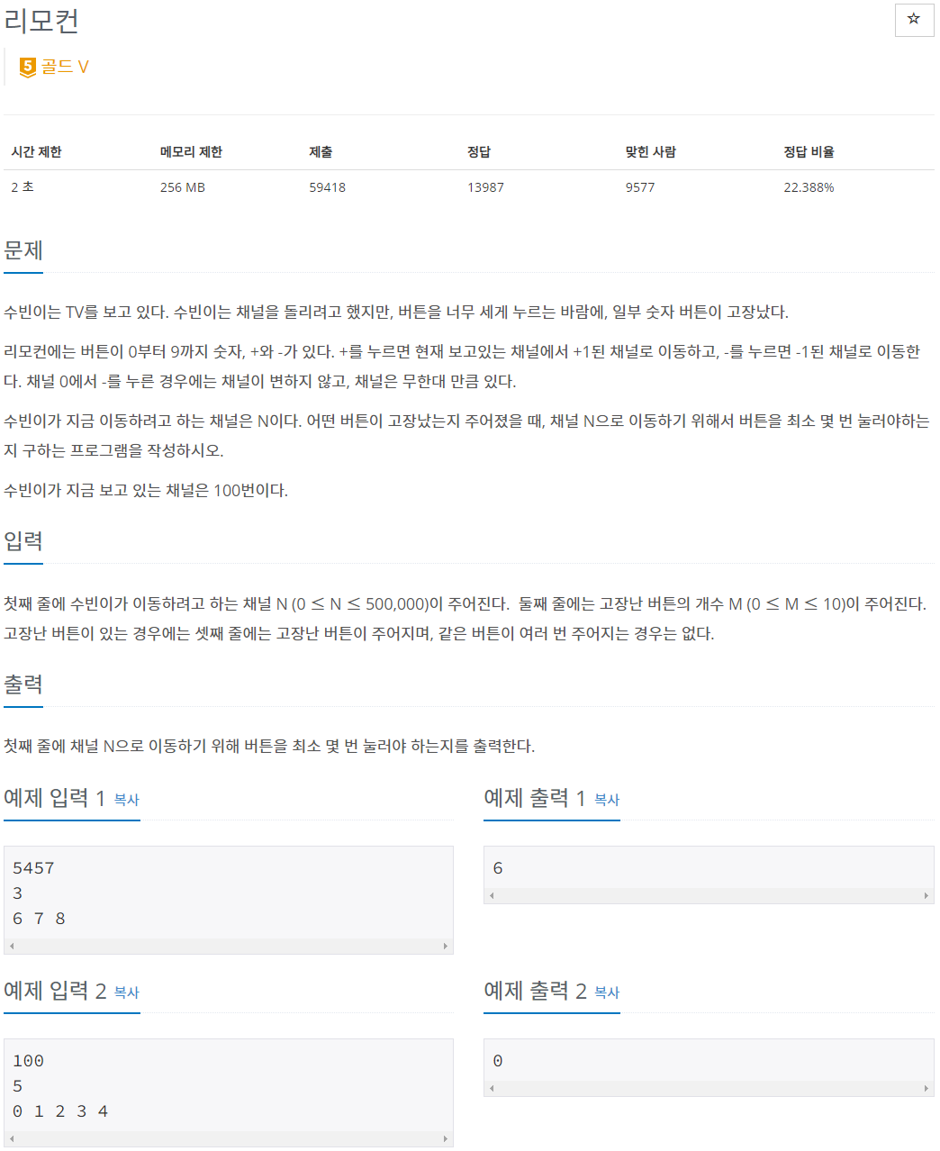 이동하려는 채널은 500000이하지만 9를 제외한 모든 버튼이 고장났을 수도 있으므로 999999에서 이동하는 횟수도 고려해야 했다.