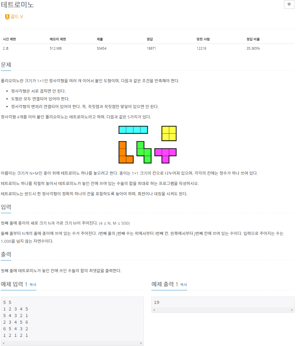 DFS를 이용해서 'ㅗ' 모양의 테트로미노를 제외하고 나머지 테트로미노의 합을 구할 수 있다.