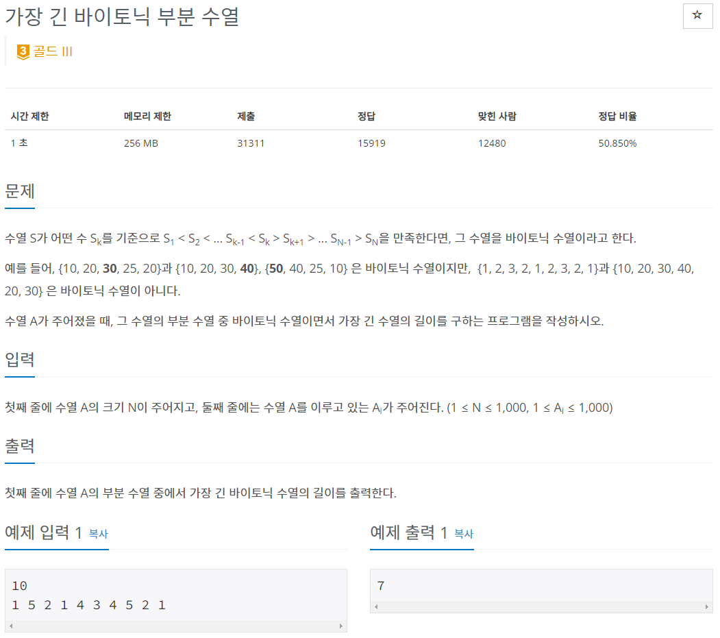 가장 긴 증가하는 부분 수열 + 가장 긴 감소하는 부분 수열을 합친 문제이다.