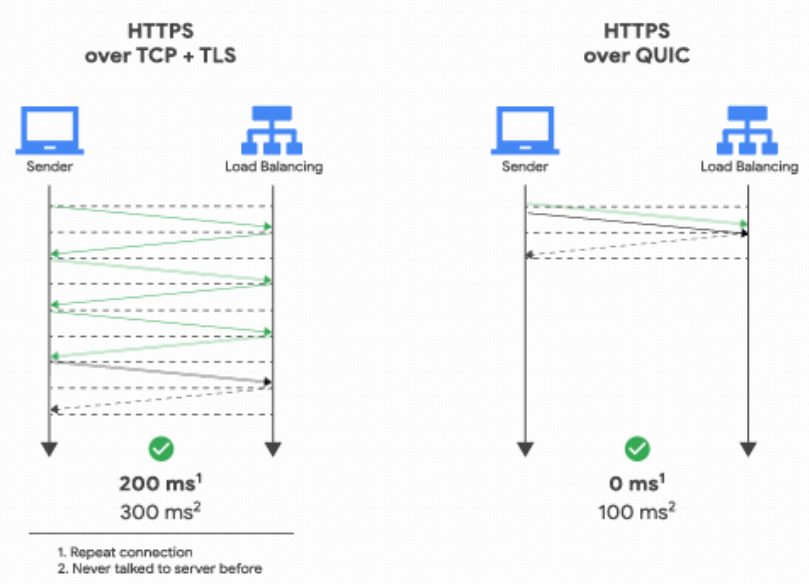 이에 반해 QUIC 첫 연결 설정에 1 RTT만 소요됩니다.