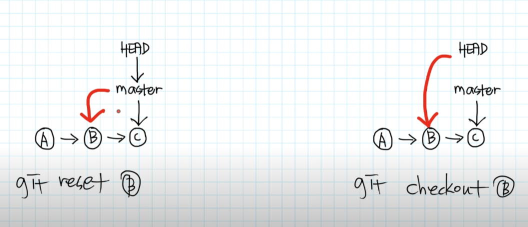 reset을 더 잘 이해하기 위해서 checkout과 비교를 해보면 좋다. checkout은 HEAD를 직접적으로 가리키도록 바꾼다. reset은 HEAD가 브랜치를 가리키고 있을 때 그 브랜치가 가리키고 있는 버전을 바꾼다. 만약 HEAD가 아무 브랜치를 가리키고 있지 않을 때는 checkout처럼 HEAD를 바꾼다. 그림에서 보듯이 reset과 checkout은 엄연히 차이점이 존재하지만 두 명령어 모두 working directory는 B 인 상태로 같다는 공통점이 있다. reset은 master가 가리키고 있는 버전을 바꿨고 checkout은 HEAD만 바꿨다. reset명령어를 실행하면 C를 더이상 아무도 바라보고 있지 않기 때문에 log로 확인해보면 눈에 보이지 않는다. delete와 같은 효..