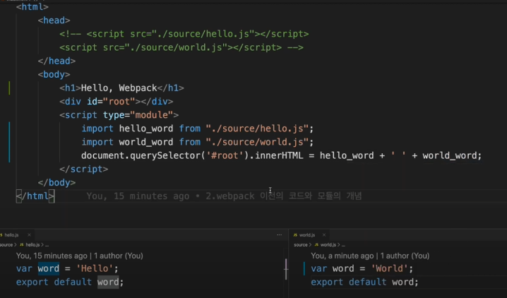 Webpack이란? 여러개의 파일을 하나의 파일로 묶어주는 개발 자동화 도구 먼저 기존 script로 불러오는 것들 type을 module을 지정해서 똑같은 이름의 변수를 다르게 지정하여 사용할 수 있다. 변수 이름의 충돌은 위와 같이 import, export 구문으로 피할 수 있다. 저렇게 지정하면 word라는 변수를 사용할 수 없다. 그리고 import, export는 비교적 최신 기능이어서 오래된 웹 브라우저에서는 동작하지 않는다. 또 Network 탭에서 hello.js와 world.js 파일이 각각 다운로드 받아진다. 변수의 충돌을 없애고 해당 파일들을 각각 받지 않고 하나로 묶어서 자원을 아끼고 각각의 파일을 모듈로 만들어 사용할 수 없을까라는 생각에 번들러가 만들어졌다. 번들러라의 대표주자..